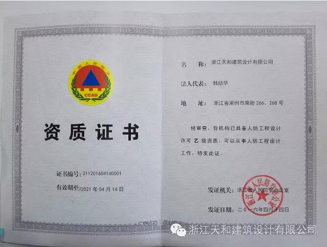 熱烈祝賀天和設計獲得浙江省人民防空辦公室頒發的人防工程設計乙級資質,為浙江省內首批,湖州市獨家!自此,我公司可承接浙江省范圍內建筑面積2萬平方米以下人防工程建設項目(不包含各類人防指揮所)主體工程、配套工程及地面附屬設備設施用房的設計業務。